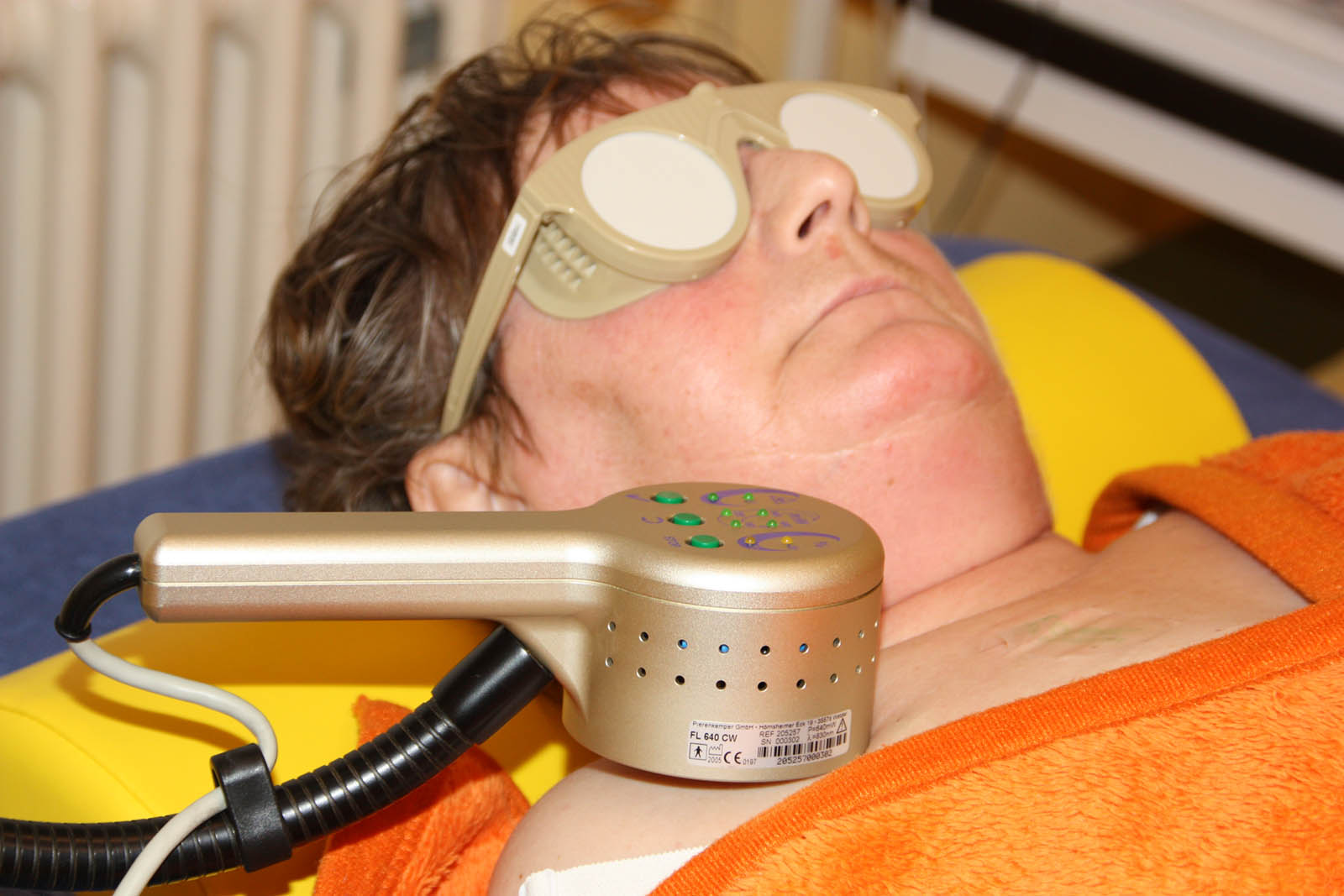 Die Bestrahlung der schmerzenden Region erfolgt für 10 Minuten - je nach Länge der Krankengeschichte sind 6-10 Bestrahlungen im Abstand von 2 -7 Tagen notwendig.